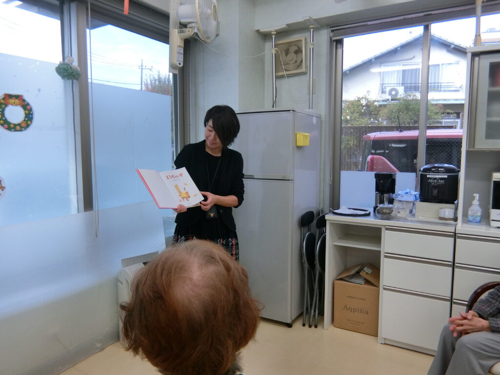 今回で12回目を迎える読み合わせの時間。噂を聞きつけたケアマネさんが見学に来てくださいました。ご自身のご利用者様がどのように楽しまれているか見てご家族様に伝えるとのこと。