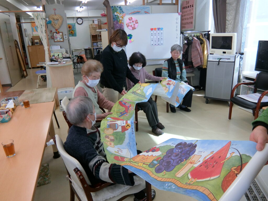 絵本が巻物になりました。いろいろなアイデアで私たちを楽しませてくださる